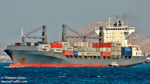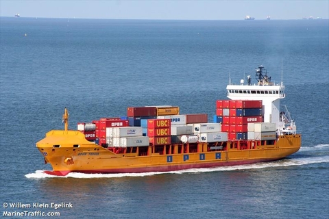 It’s carrying capacity is 698 TEU and her current draught is reported to be 5 meters. Her length overall (LOA) is 129.6 meters and her width is 20.82 meters.